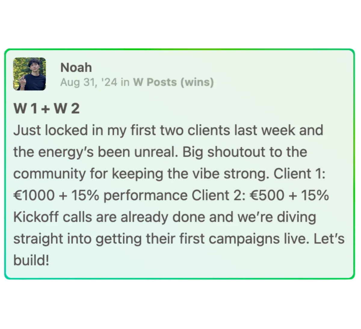 You’ll get 1:1 access to a 7-figure agency mentor, live Q&A sessions, feedback on your offers and outreach, and our private Slack community for daily accountability and support.